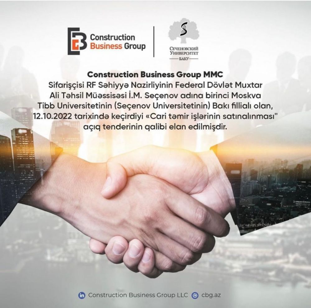 "Construction Business Group"LLC was declared the winner of the open tender for the "Purchase of current maintenance works" , held on October 12 2022 , the customer of which is “Baku branch of the First Moscow State Medical University named I.M. Sechenov"