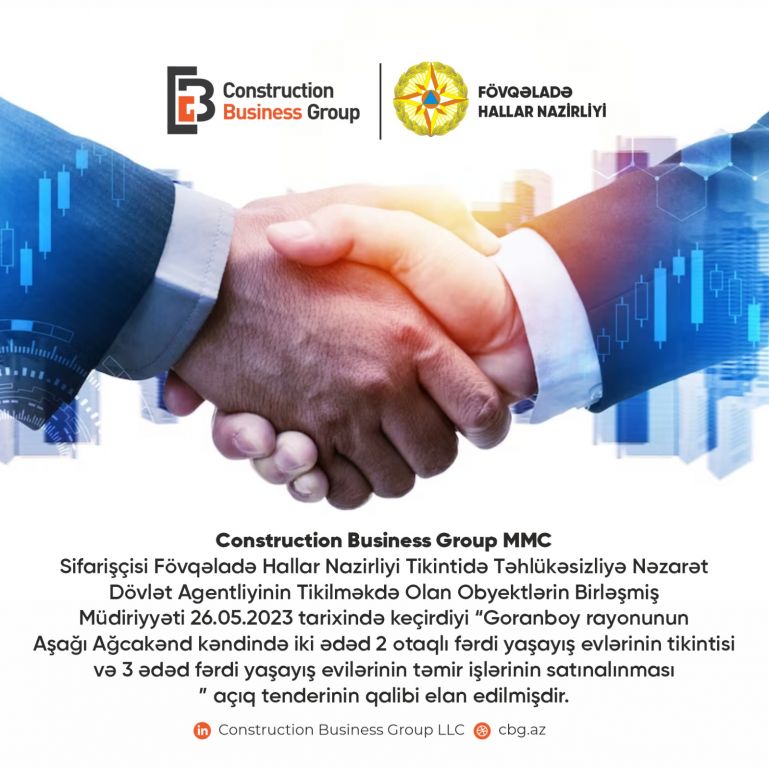 "Construction Business Group"LLC was declared the winner of the open tender for the « Construction of two 2-room private residential houses and purchase of repair works of 3 private residential houses in Ashagi Aghjakend village of Goranboy district » , held on May 26 2023 , the customer of which is “Ministry of Emergencies United Directorate of Buildings Under Construction State Agency for Safety Control in Construction”